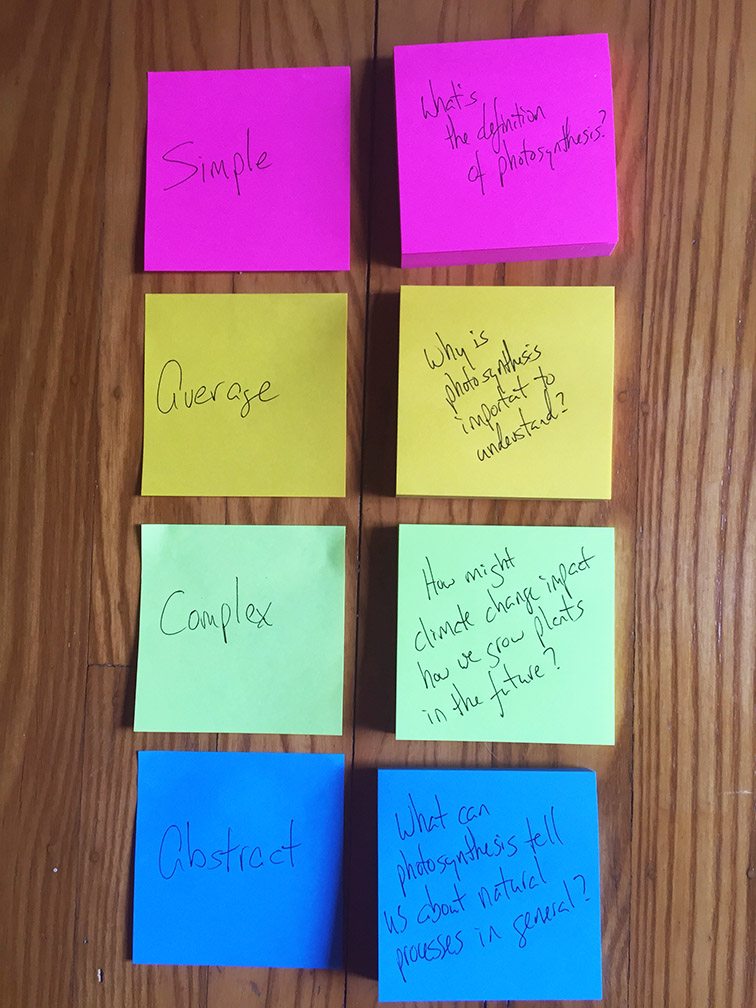 The big idea of this Post-it® Super Sticky Note activity is to promote critical thinking by helping students see questions in terms of levels and fluidity–from simple to abstract, and capable of changing based on learning and understanding.