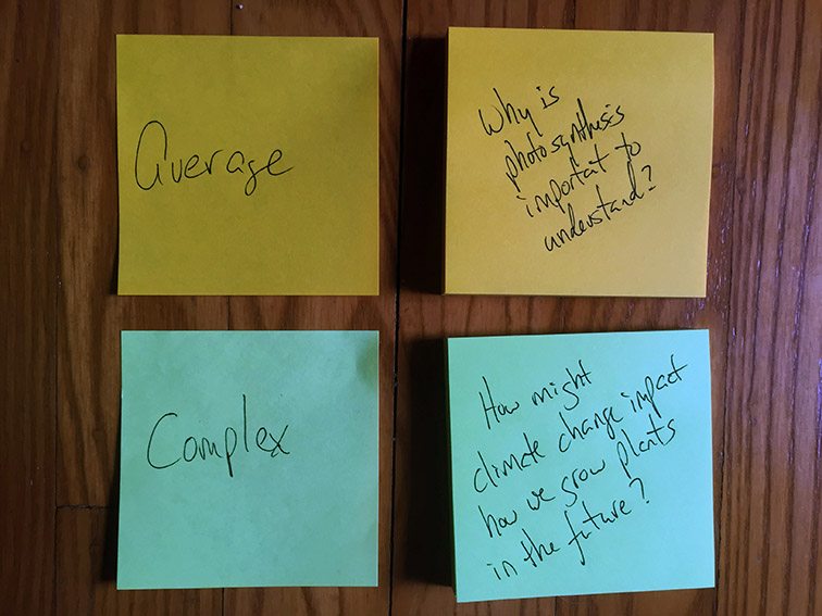 Green Post-it® Super Sticky Notes = Complex questions: At this level, questions are always open-ended, and answering them requires in-depth explanations, as well as predicting, inferring, and deductive reasoning.