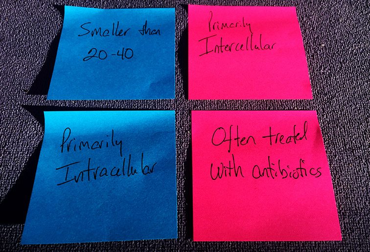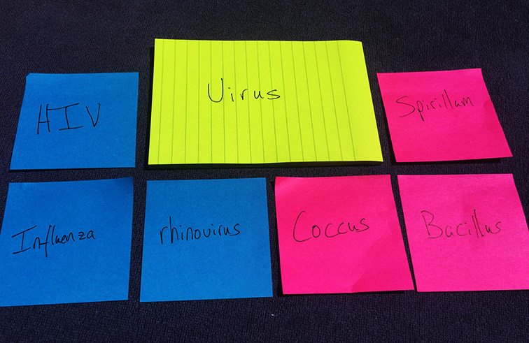 The first step is to choose a concept from your curriculum map or content area–ideally this would be a critical idea or term for the students to understand. This concept should be written on a 4in x 6in Post-it® Super Sticky Note. In this example, we chose Virus.
