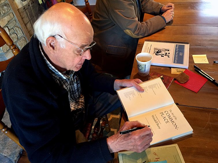 Wendell Berry had leaped from my mind–where I chased him endlessly without ever gaining an inch—to a plain chair with a wicker back and a stain a shade darker than the table in front of him, his pen marking book after book as the people talked quietly around him, smiling and nodding and reconciling meaning of their own.
