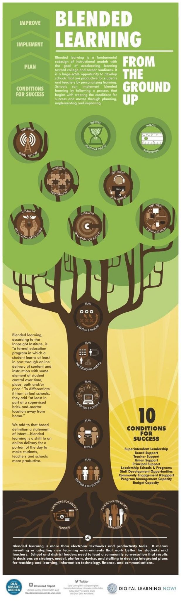 The following infographic from Digital Learning Now! offers a similar definition of their own, but additionally offers up the idea of conditions for success with blended learning. These factors include superintendent leadership, administrator support, budget capacity, and staff training.