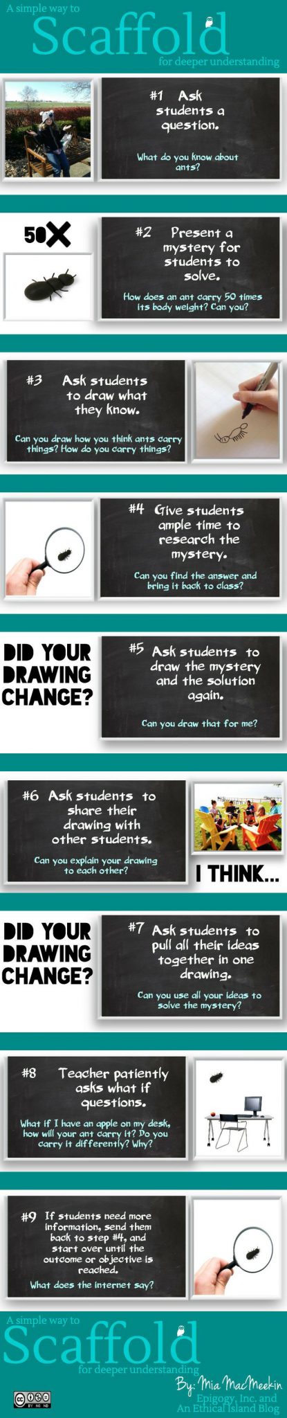 Every student needs a different kind of support, often failing to prove what they know for different reasons–wait time, confidence, reading levels, and so on. The following infographic via Mia MacMeekin offers up nine steps that, when followed, represent a scaffolding strategy that can work across grade levels and content areas.
