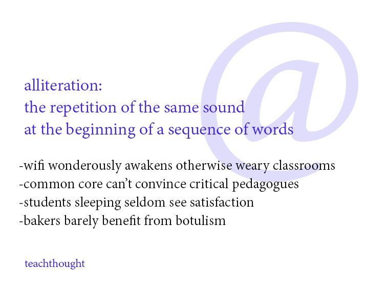 Alliteration is the repetition of the same sound at the beginning of a sequence of words. As a literary device, we all learned about it in elementary school. Sally and her seashells, Peter and his peppers.