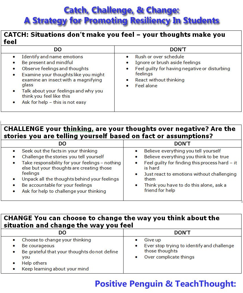 Thankfully these countries and many others have wonderful organizations to help people suffering from anxiety and depression and related issues. But each of us must be more proactive in changing these statistics for our future generations. What can we do to foster a resilient mindset in young people? Catch, Challenge, and Change is one of many possible strategies for promoting resilience in children and students.