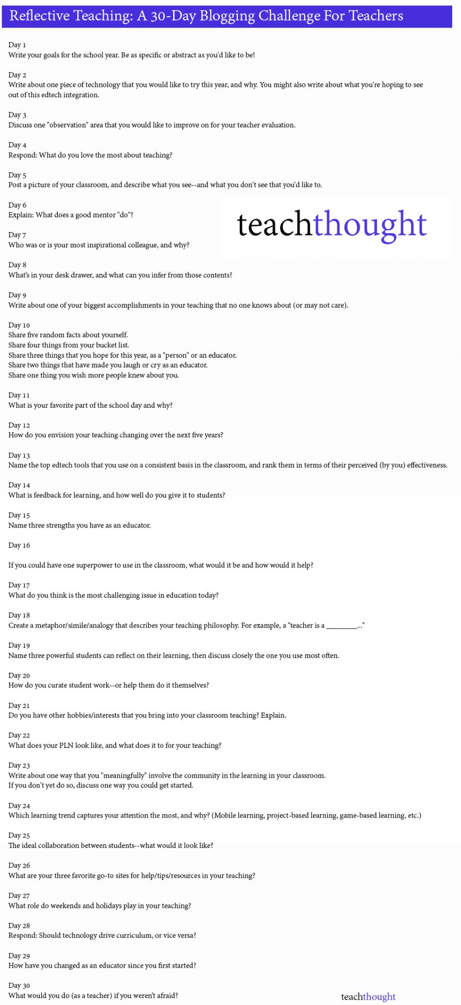 Well, through the work of Beth Leidolf and Justine Hughes, September is Reflective Teacher month at TeachThought. Beth and Justine have created a blogging challenge for you to take, share with your colleagues, and use as reflective tools for growth.