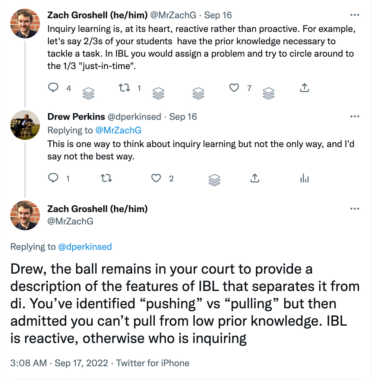 As a staunch advocate of inquiry and PBL, I regularly find myself engaging and pushing back on those who, in my view, unfairly denigrate it on Twitter. One such interlocutor is Zach Groshell, an instructional coach and host of the Progressively Incorrect Podcast. Most of our interactions look like the exchange shown below although a few were a little more testy.