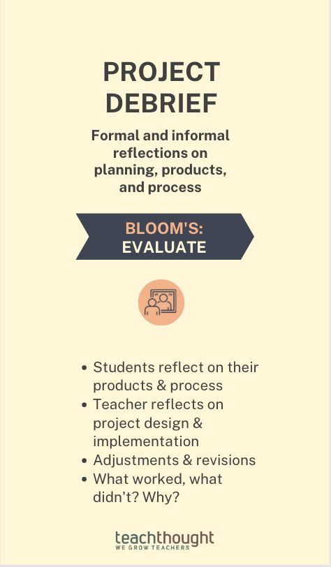 In addition to your professional reflections, there is much learning to be had by asking students to evaluate (Bloom’s) their performance and learning in the project. What worked for them and what didn’t, and why? This metacognitive process is a great way to consolidate learning and think about themselves more deeply as learners.