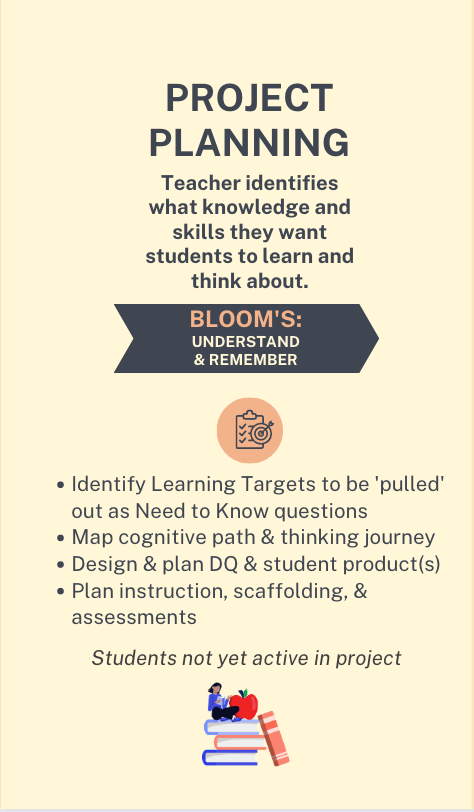 In this phase, students are not yet active in the project and teachers are identifying the things they want them to understand and remember (Bloom’s). This is the knowledge and concepts you’ll ask them to think critically about and with through the project, and you’ll want to consider which are just basic knowledge to be remembered and what lends itself to meaningful application toward deeper learning and understanding.