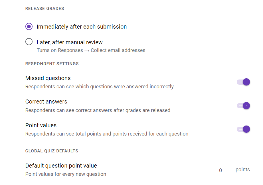 - Set your desired settings regarding when to release grades, and toggle your respondent settings ‘On’ or ‘Off’ — you can also set a default question point value.