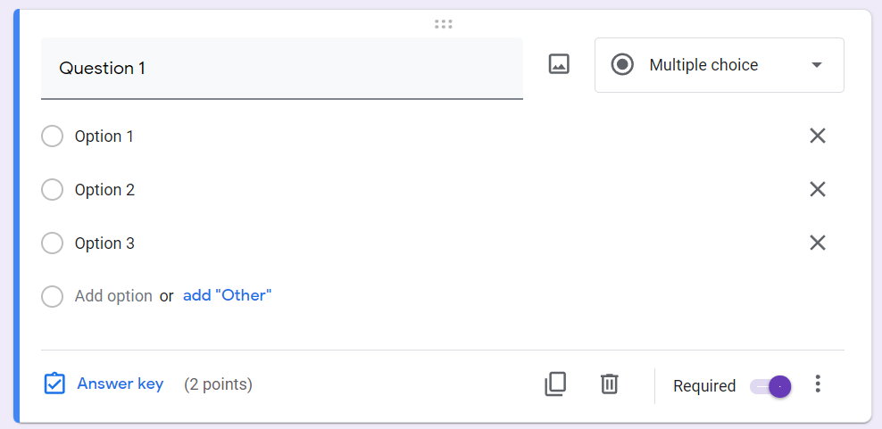 - Type in your question and answer selections (if providing choices). If you are requiring students to answer the question before submitting, you can toggle the ‘Required’ icon to ‘On’.