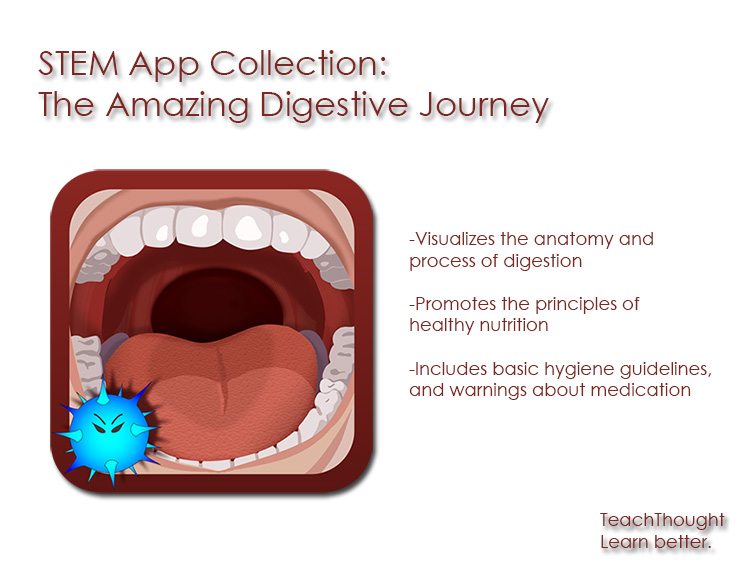 Developer Description: “With The Amazing Digestive Journey, users easily pilot through a virtual simulation of the systems and structures of the mouth, esophagus, intestines and other organs, all depicted in detailed imagery. The user-friendly interface of the app lets kids explore and learn, while advancing to different sections at their own pace. At each stage, users can click for more information; and acquire a deeper understanding of the digestive system.”