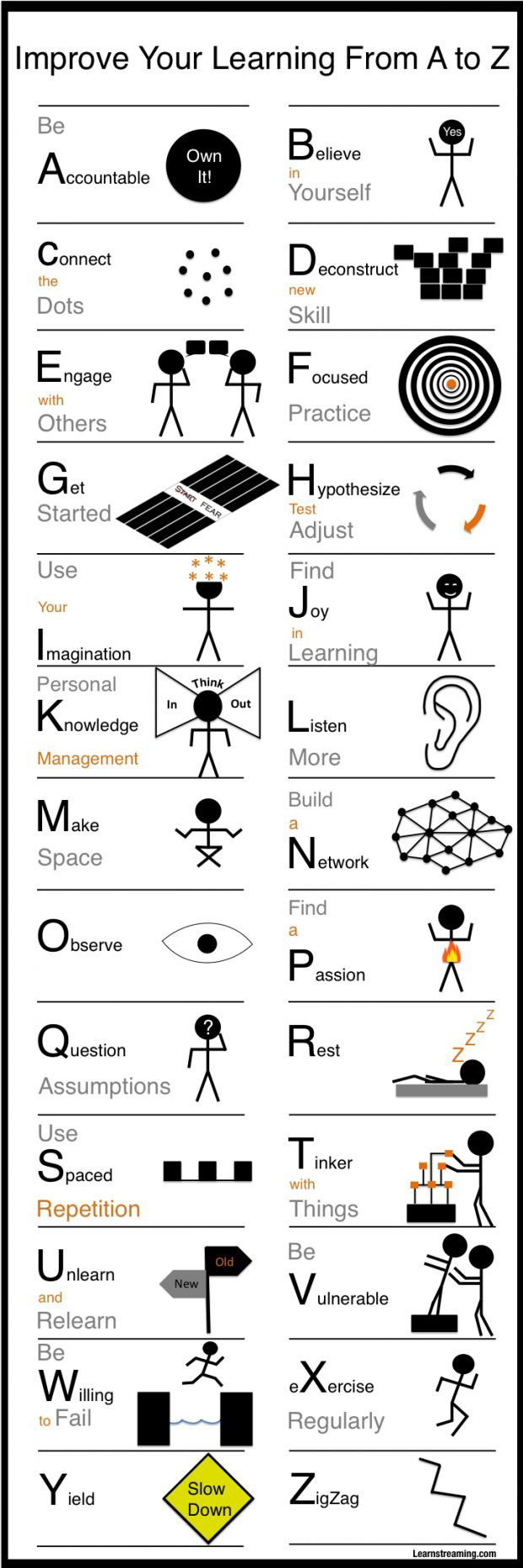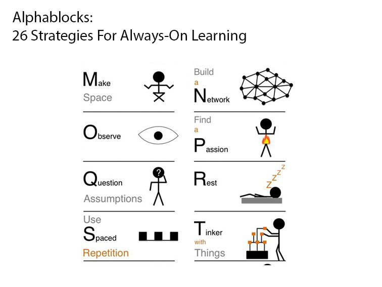 Many of these learning strategies can be applied to reading, which is where we hear about them most. The following graphic from learnstreaming.com gathers 26 of these strategies into an alphablocks format, and includes