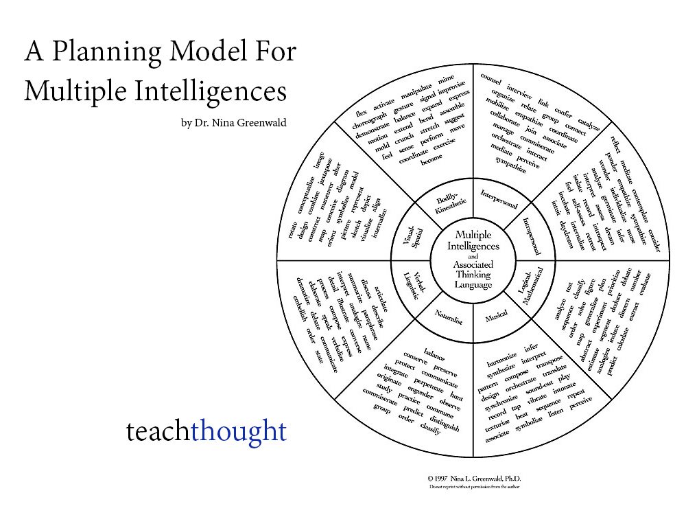 In spite of this misunderstanding, and of the unconvincing body of research supporting ‘multiple intelligences,’ using the framework to plan can be useful because they represent ways of thinking, acquiring data, connecting to content, and providing a foundation for learning experience. It may well be that letting one child learn one through intrapersonal reflection and another through interpersonal connections may not provide an advantage to either child.
