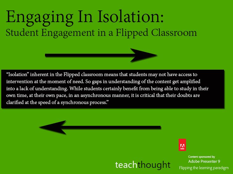 “Isolation” inherent in the Flipped classroom means that students may not have access to intervention at the moment of need. So gaps in understanding of the content get amplified into a lack of understanding of concepts, eventually leading to drop outs. While students certainly benefit from being able to study in their own time, at their own pace, in an asynchronous manner, it is critical that their doubts are clarified at the speed of a synchronous process.